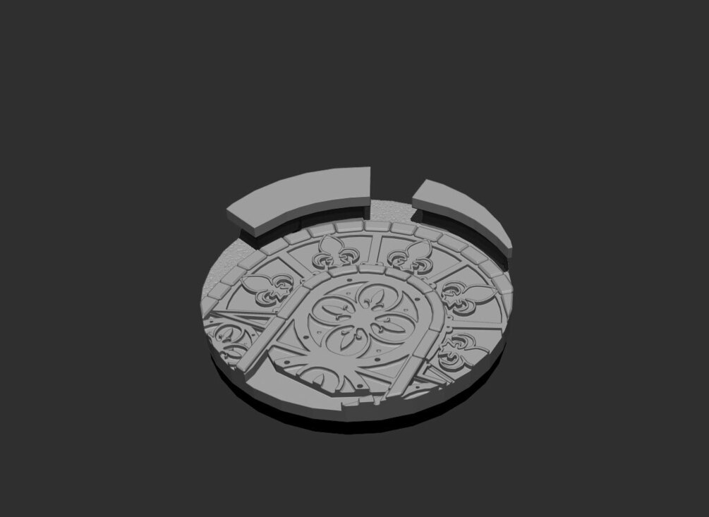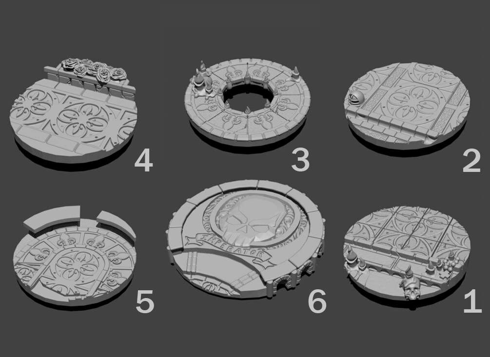 Gothic style bases for miniatures. Design 1 to 5 are 29 millimeter meant to to glued on to 32 millimeter miniature base, while Design 6 is 37 millimeter meant to be glued to 40 millimeters miniature base.